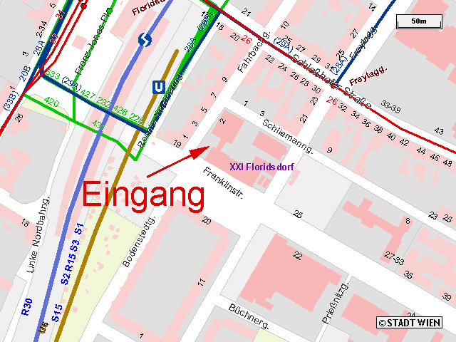 Auto: bitte für Routenplaner "Fahrbachgasse 2" angeben, da Franklinstraße 21 Fußgängerzone! Öffentlich: Hauptbahnhof Floridsdorf (U6 Endstation, Schnellbahn S1,S2,S3, etc...)