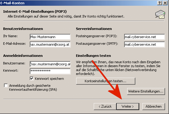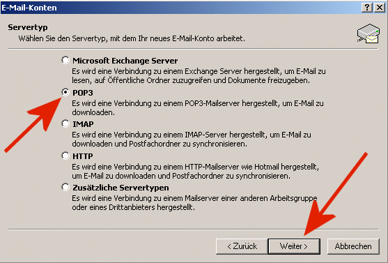 Menü Extras: 4) Geben Sie als Typ "POP3"